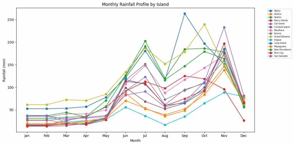 Multiline chart showing each island’s rainfall month by month, highlighting trends through the year.