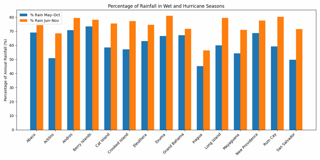 Grouped bar chart comparing how much of each island’s annual rainfall falls in the wet season (May–Oct) and hurricane season (Jun–Nov)