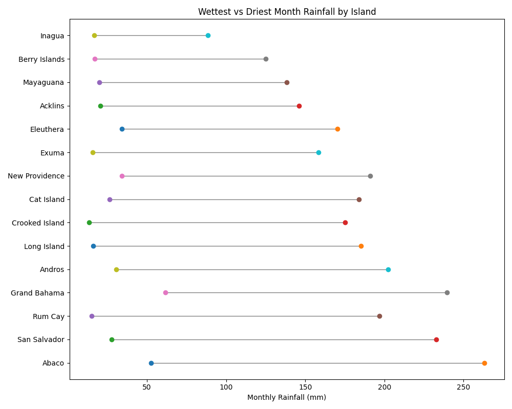 Lines connect the rainfall amounts of the wettest and driest months for each island, illustrating the size of the seasonal swing,